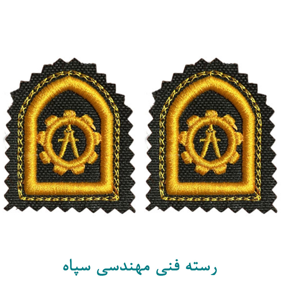 آرم یفه نظامی (رسته نظامی فنی مهندسی سپاه) پارچه ای فنی مهندسی سپاه انقلاب اسلامی ایران به رنگ طلایی و زمینه مشکی دالبور شده جهت نصب بر روی یقه لباس.