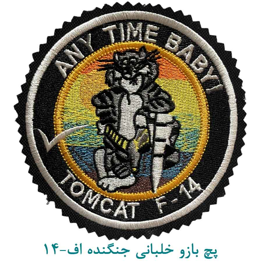 آرم سینه جنگنده اف-14 تامکت (Grumman F-14 Tomcat) با طرح زیبای Any time baby دالبور شده با کیفیت بالا و تمام دوخت، گلدوزی شده با نخ درجه یک مناسب برای نصب بر سینه لباس و کاپشن خلبانی.