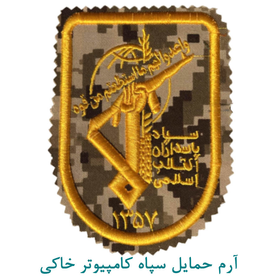 آرم حمایل سپاه پاسداران پارچه ای به رنگ طلایی با زمینه کامپیوتر خاکی و دالبور شده مناسب برای نصب بر حمایل نظامی در ابعاد استاندارد.