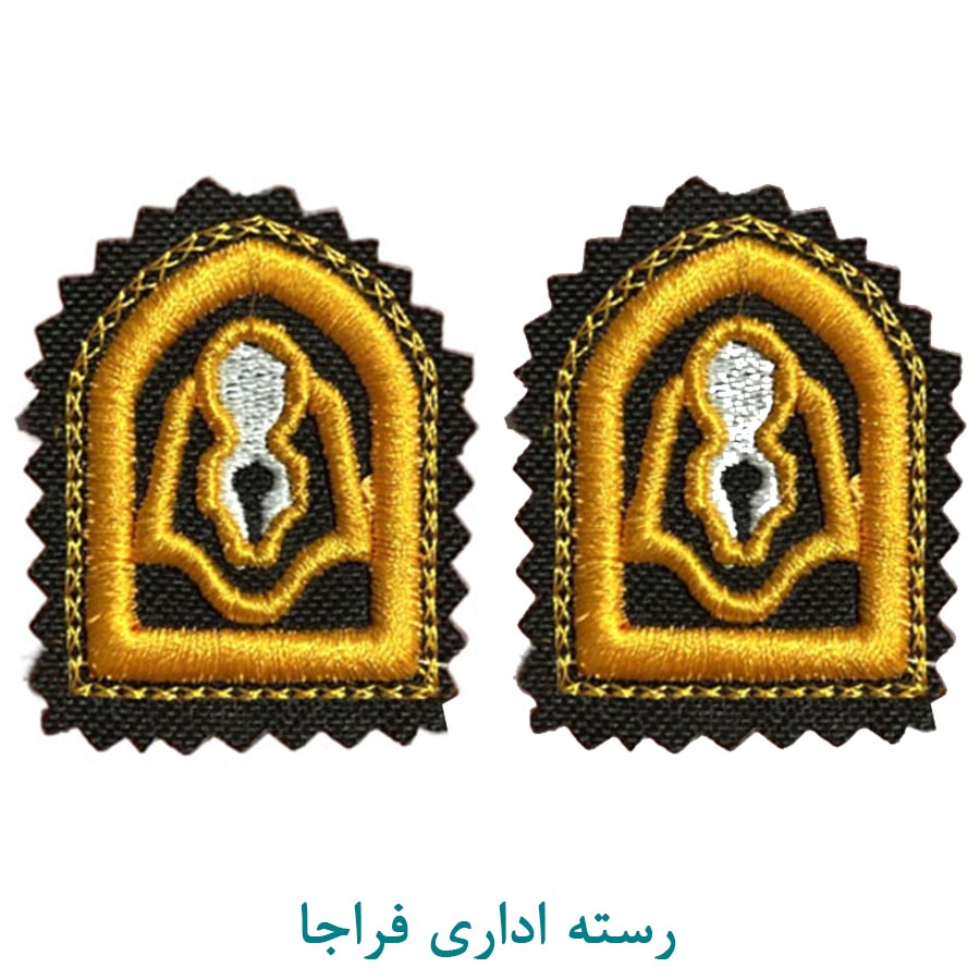 آرم یفه نظامی (رسته نظامی اداری فراجا) پارچه ای اداری فراجا و نیروی انتظامی به رنگ طلایی و زمینه مشکی دالبور شده جهت نصب بر روی یقه لباس.