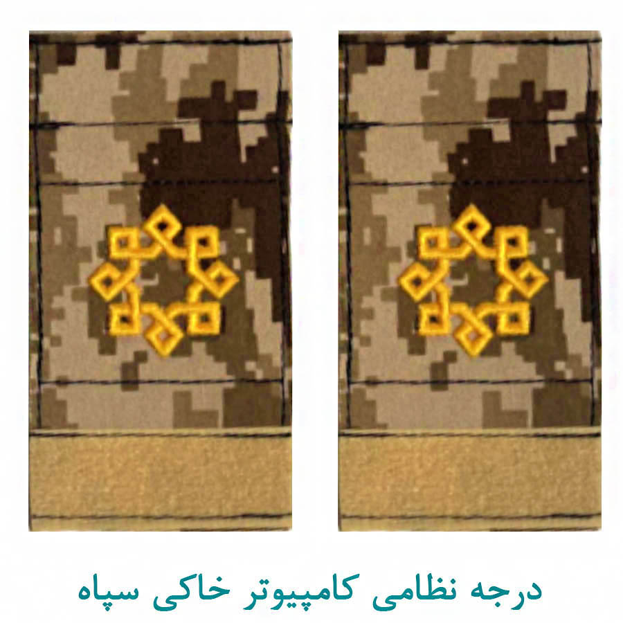 درجه پارچه ای ستوانسوم به رنگ کامپیوتر خاکی با نخ طلایی و به صورت جفتی، گلدوزی شده مناسب برای نصب بر لباس پرسنل کادر سپاه در ابعاد استاندارد.