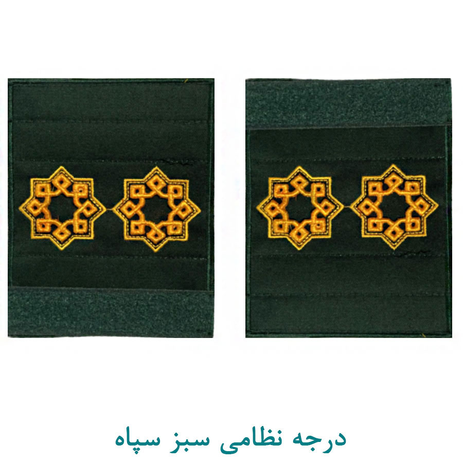 درجه پارچه ای ستوان دو به رنگ زمینه سبز با نخ طلایی و به صورت جفتی، گلدوزی شده مناسب برای نصب بر لباس پرسنل کادر سپاه در ابعاد استاندارد.