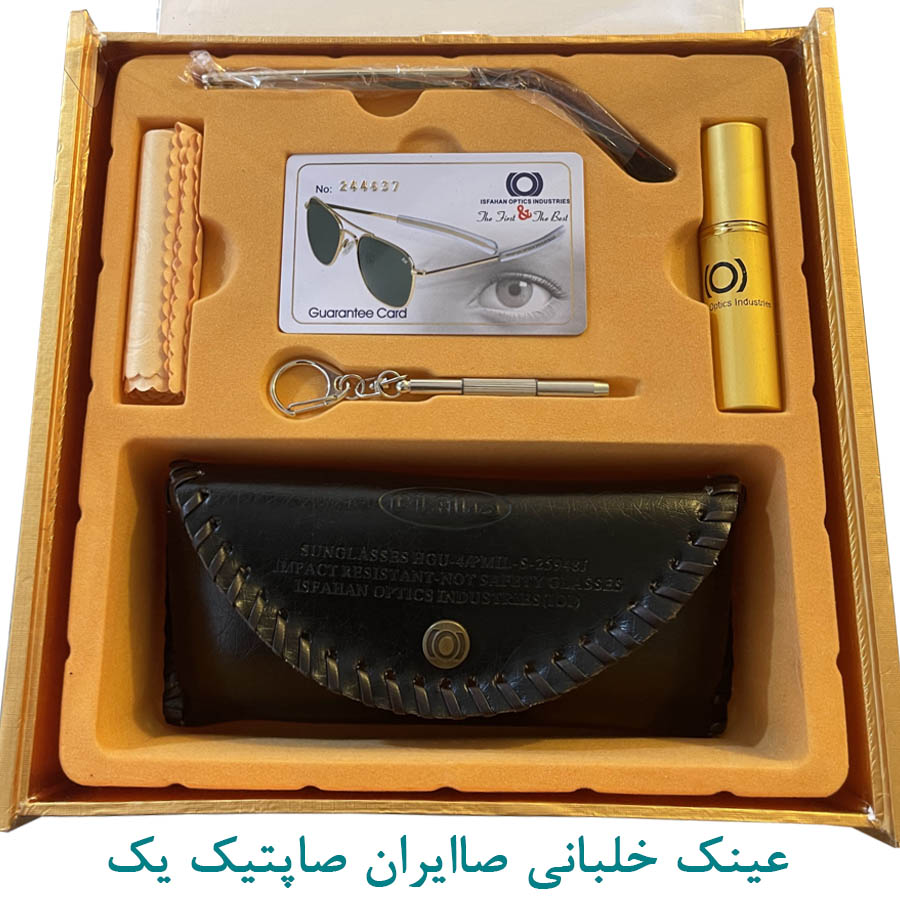 عینک خلبانی صاایران مدل صاپتیک1 با فریم طلایی و شیشه سبز در سایز های 52 و 55 و 57 در باکس زیبایی طلایی سفید بصورت اورجینال.