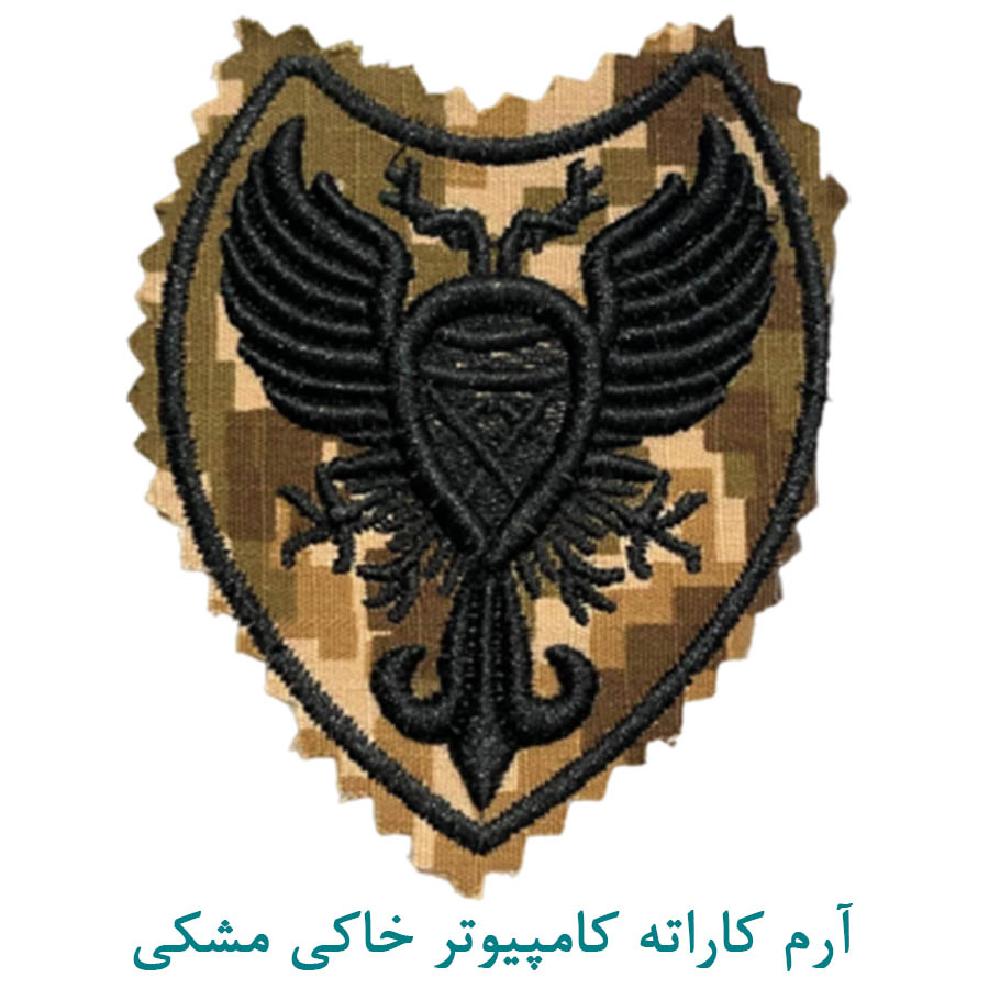 آرم بازو دوره ورزشی کاراته پارچه ای به رنگ مشکی با زمینه دیجیتال خاکی و دالبور شده مناسب برای نصب بر انواع لباس نظامی و تاکتیکال در ابعاد استاندارد.