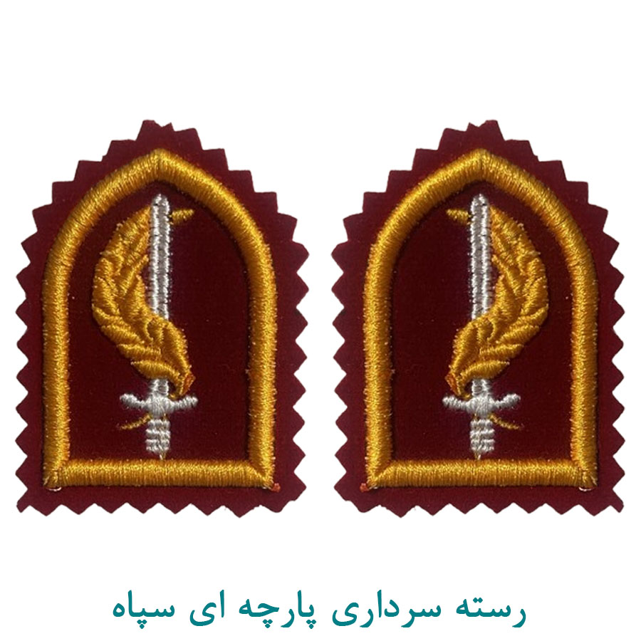آرم یفه نظامی (رسته نظامی) پارچه ای سپاه پاسداران و نیروی انتظامی به رنگ طلایی و قرمز دالبور شده جهت نصب بر روی یقه لباس.