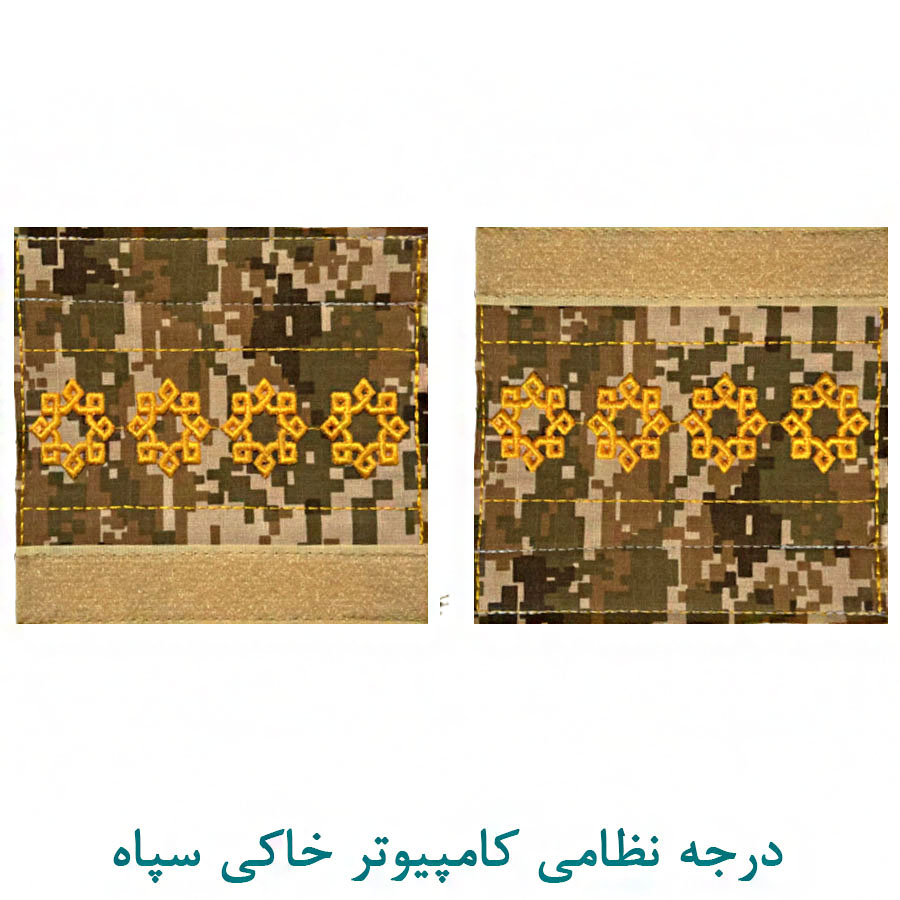 درجه پارچه ای سروان به رنگ کامپیوتر خاکی با نخ طلایی و به صورت جفتی، گلدوزی شده مناسب برای نصب بر لباس پرسنل کادر سپاه در ابعاد استاندارد.