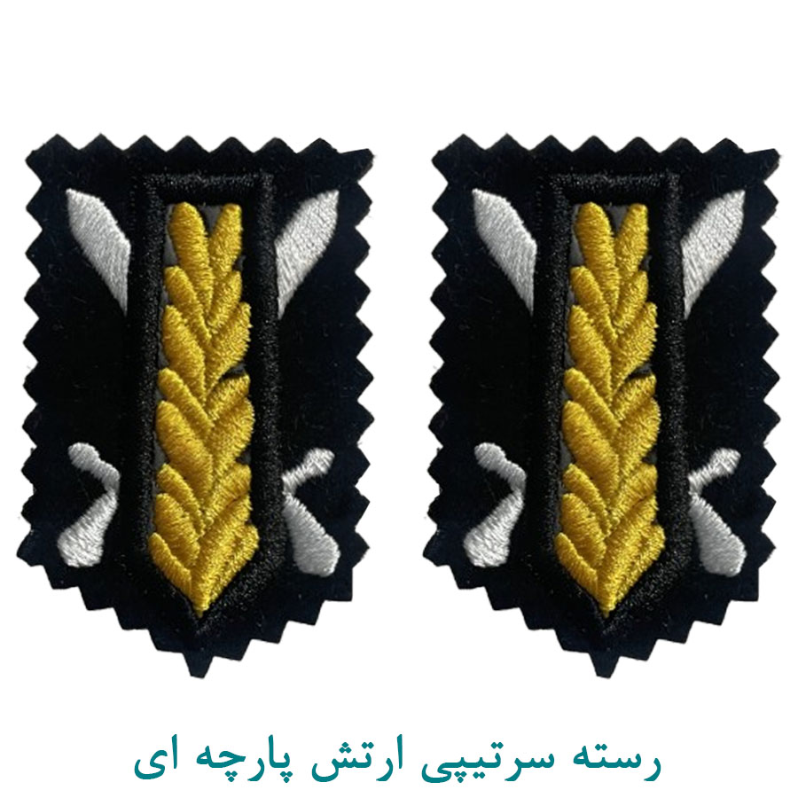 آرم یفه نظامی (رسته نظامی) پارچه ای ارتش به رنگ طلایی و مشکی دالبور شده جهت نصب بر روی یقه لباس.