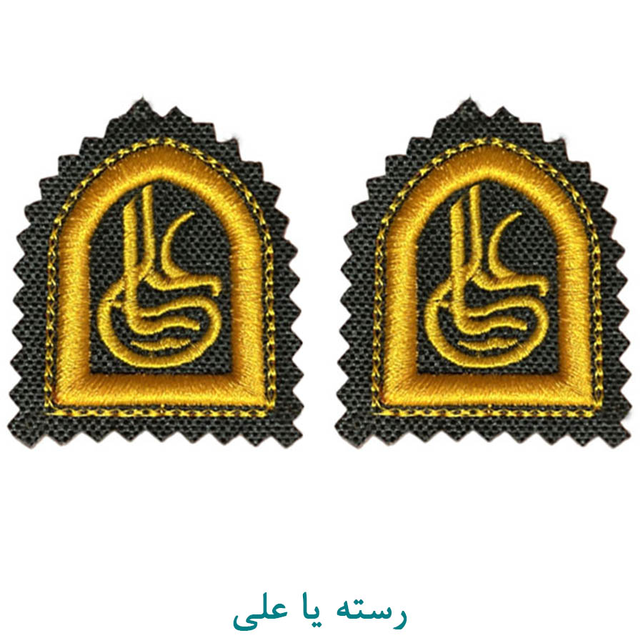 آرم یفه نظامی (رسته نظامی یا علی بسیج و سپاه) پارچه ای یا علی بسیج و سپاه انقلاب اسلامی ایران به رنگ طلایی و زمینه مشکی دالبور شده جهت نصب بر روی یقه لباس.